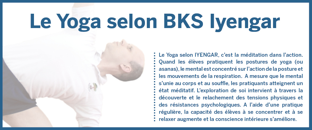 Apparu en Inde il y a plusieurs milliers d'années, le yoga est à la fois une technique corporelle et une philosophie. Le yoga selon B.K.S. Iyengar se caractérise par la pratique des postures (asanas) et de la respiration (pranayama).